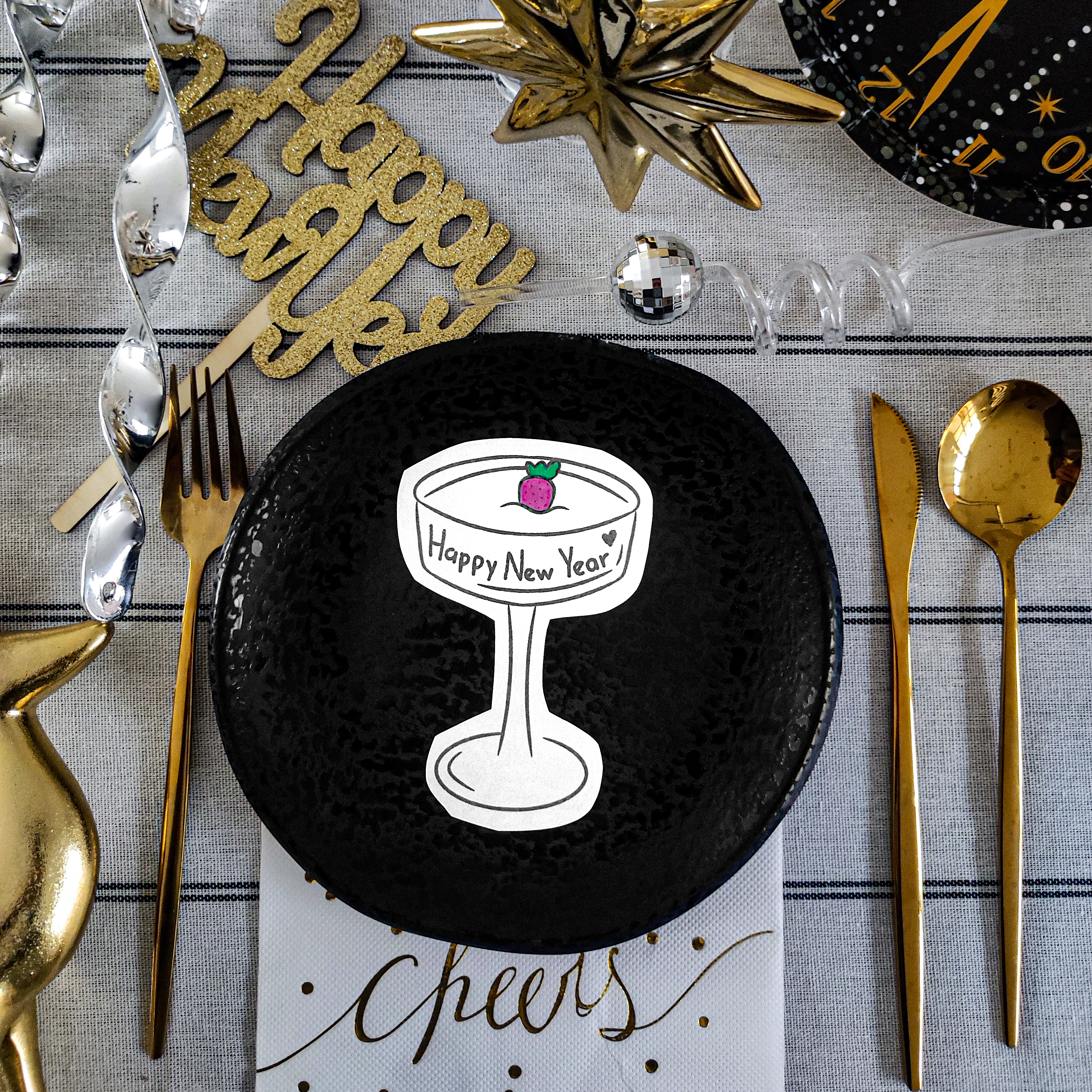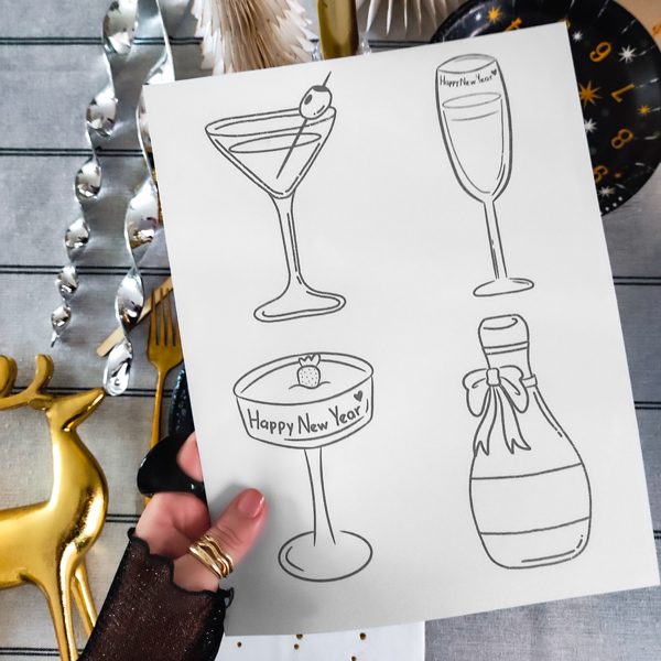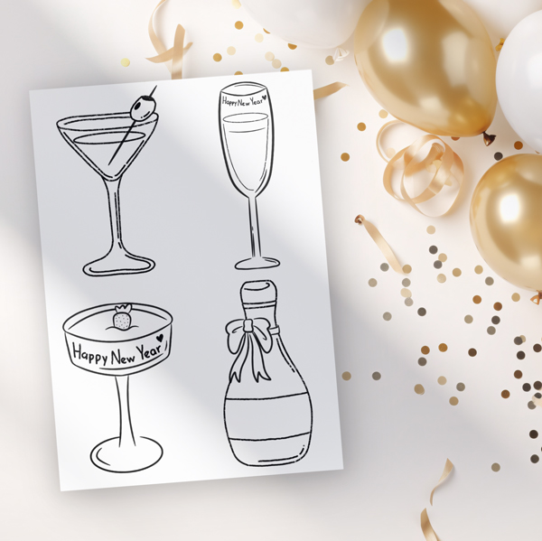 Personaliza tu fiesta de año nuevo (o lo que tu quieras) con estas ilustraciones de diferentes bebidas, puedes dejarlas en blanco y negro, colorearlas o agregar el nombre de cada invitado.